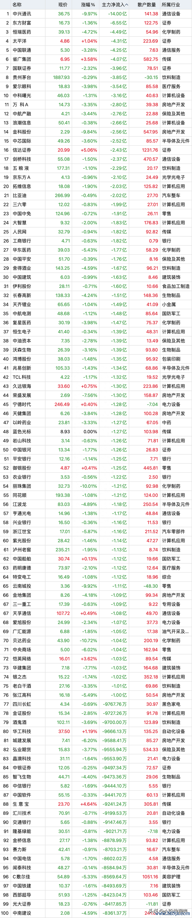 主力资金净流出占流通市值最大的个股